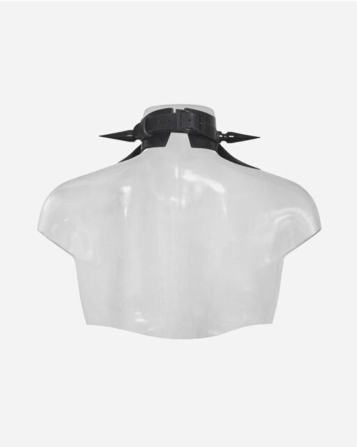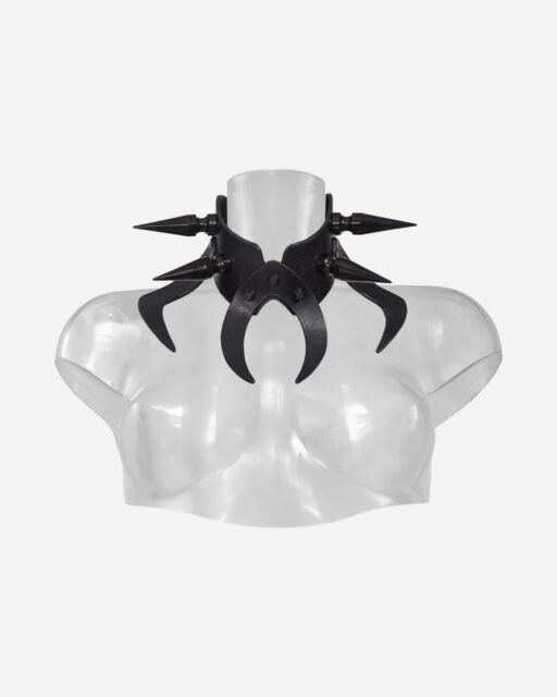 A luxurious all-black leather collar featuring sharp, symmetrical details and black metal hardware. Inspired by Catherine Monvoisin—a 17th-century figure entwined with poison, occult rituals, and scandal—this piece channels the mystique and menace of a woman who once held the court of Louis XIV in her grasp.