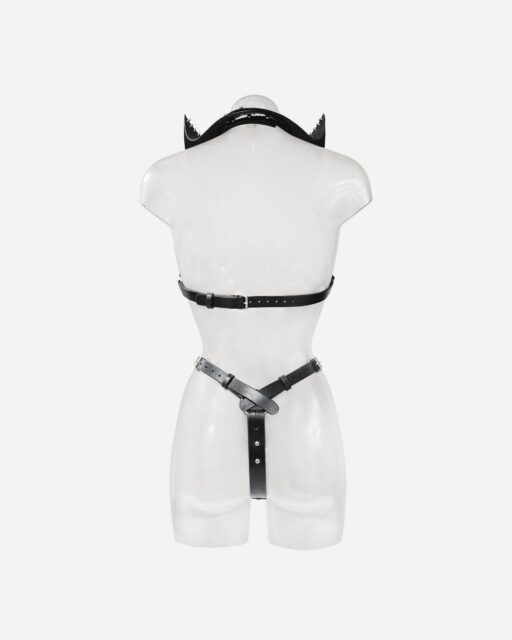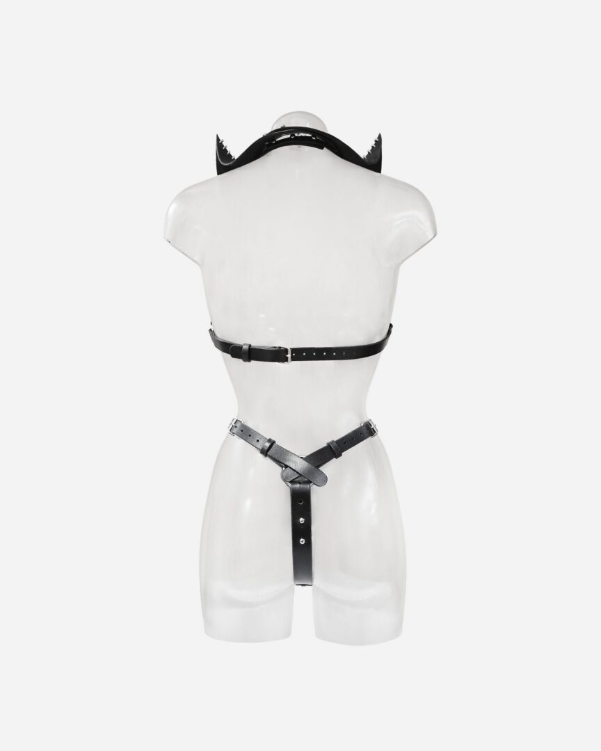 With a bold neck detail and striking asymmetric design, this leather harness conjures the power of a dark, untouchable force. Made to leave a mark they won’t forget.