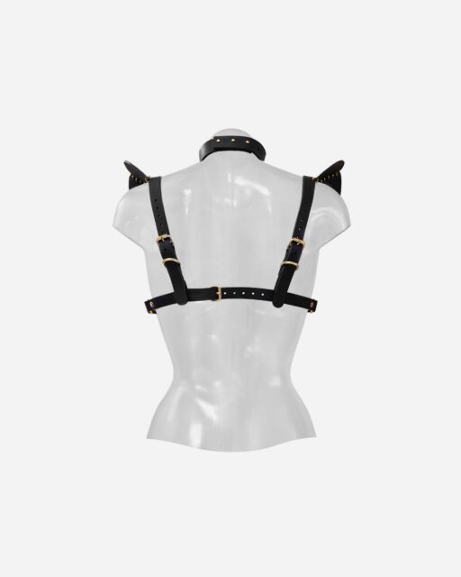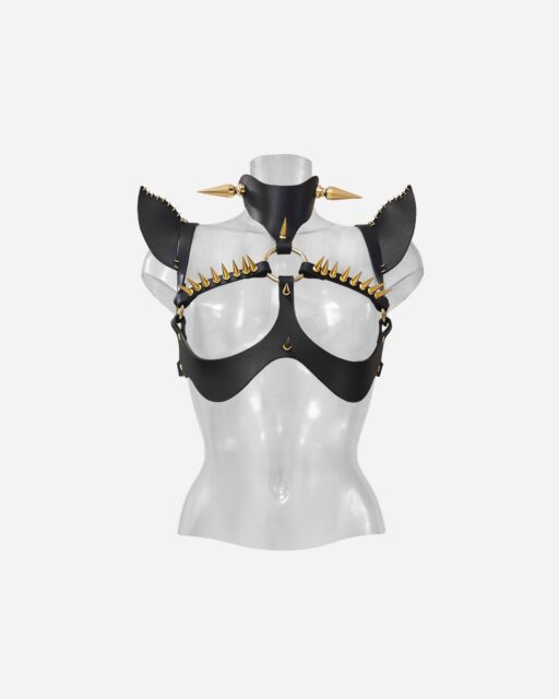 A refined evolution of the iconic bestseller, this harness is crafted from premium saddlery leather and adorned with formidable metal spikes. It channels the icy resolve of a silent enforcer—precise, unyielding, and engineered for control.