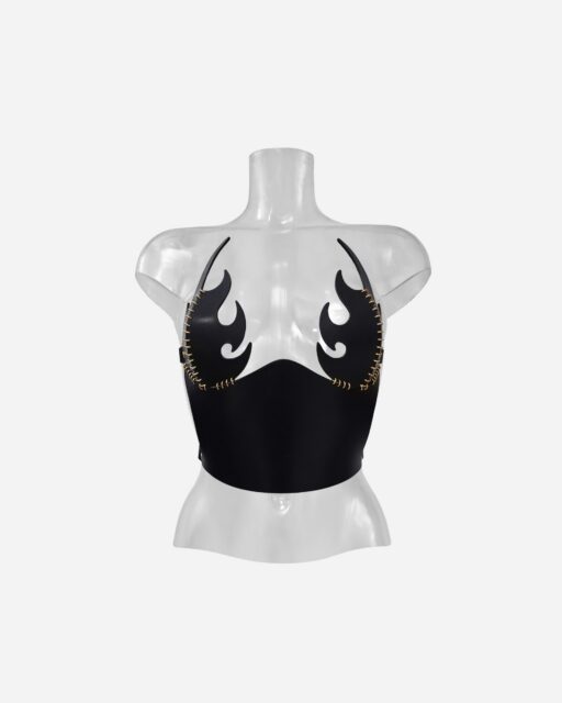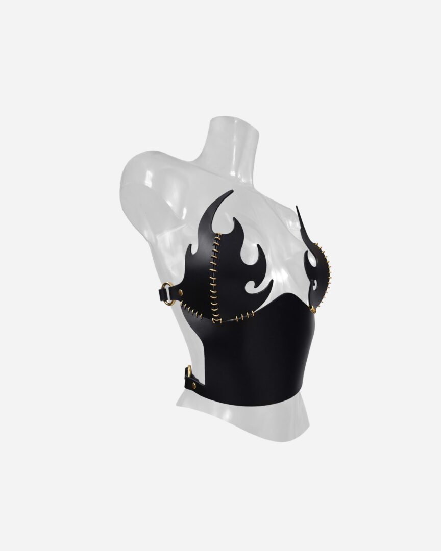 A luxurious leather bustier ignited with flame motifs and signature metal stitching. Inspired by a powerful presence that thrives in chaos, this piece is crafted from premium materials to command attention with every smoldering detail.